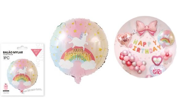 Balão Foil Redondo Happy Birthday Unicórnio 45Cm