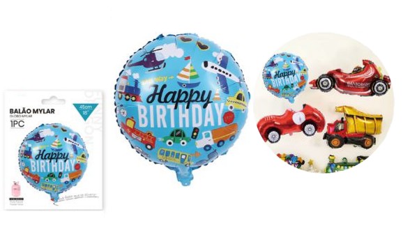 Balão Foil Redondo Happy Birthday Veículos 45Cm