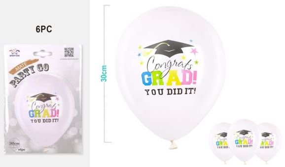 Blister 6 Balões Látex Brancos Congrats Grad You Did It 30Cm