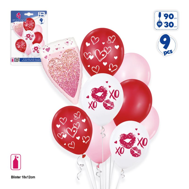 Blister 8 Balões Látex Vermelhos XOXO 30Cm + 1 Foil Copo Champanhe 90Cm