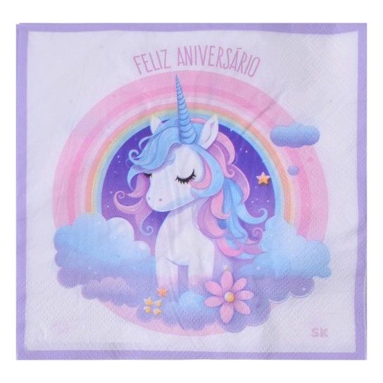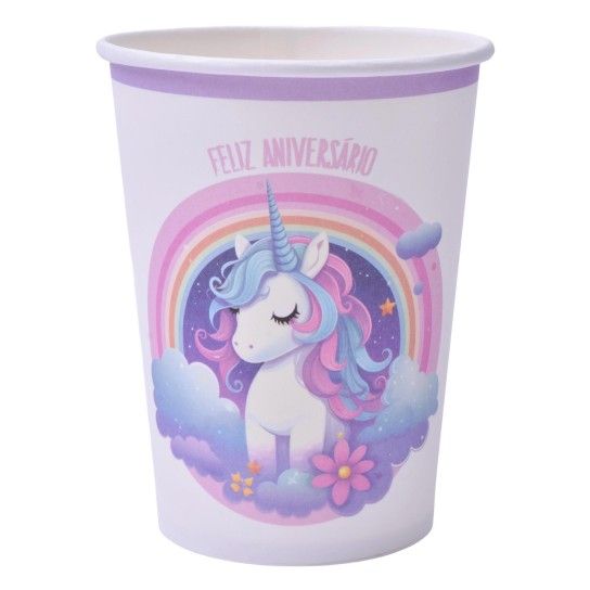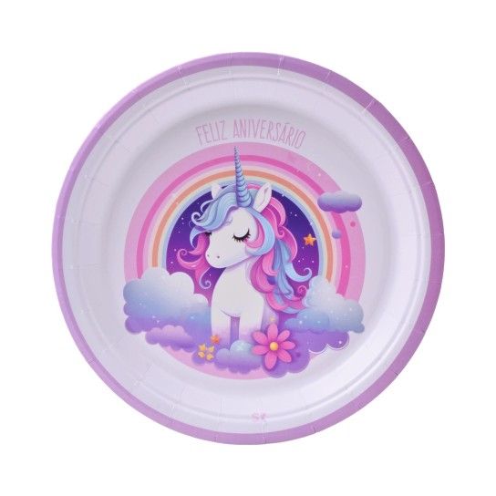 Conj. 8 Pratos 23cm + 8 Pratos 18Cm + 8 Guardanapos + 8 Copos Papel Unicórnio