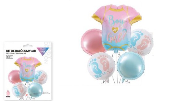 Kit 5 Balões Foil 1 Camisola Boy or Girl 63Cm 2 Redondos He or She e 2 Redondos 45Cm